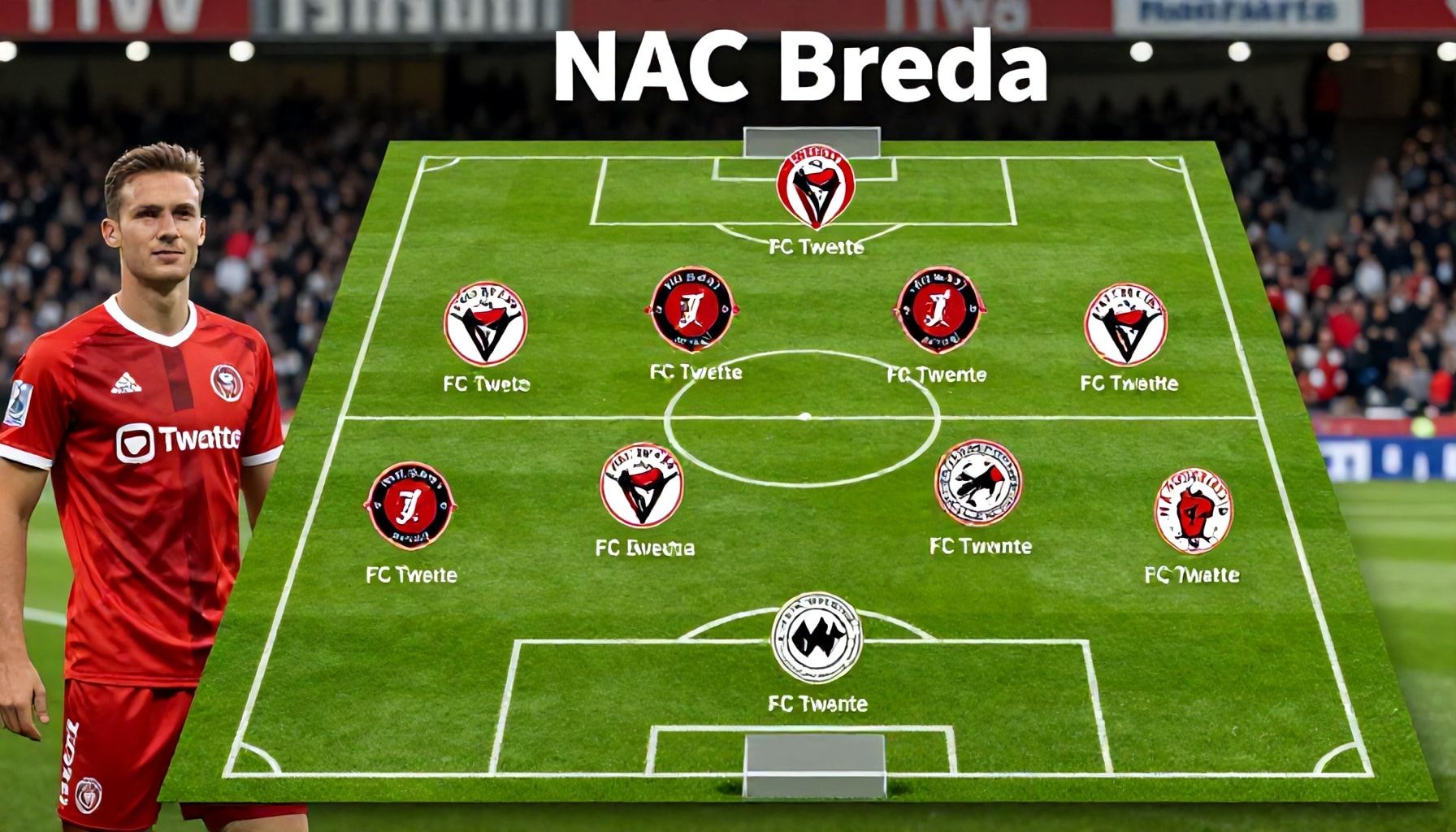 NAC Breda treedt zondag aan in een aanvalskrachtige opstelling, met een focus op snelheid en techniek. De aanval wordt geleid door de ervaren aanvoerder en spits, die dit seizoen al acht doelpunten heeft gemaakt. Naast hem staan twee snelle flankspelers, die met hun dribbelvaardigheden en kruisbalvaardigheden de verdediging van FC Twente zullen proberen te breken. De middenvelder, bekend om zijn passend vermogen en visie, zal de aanval coördineren.